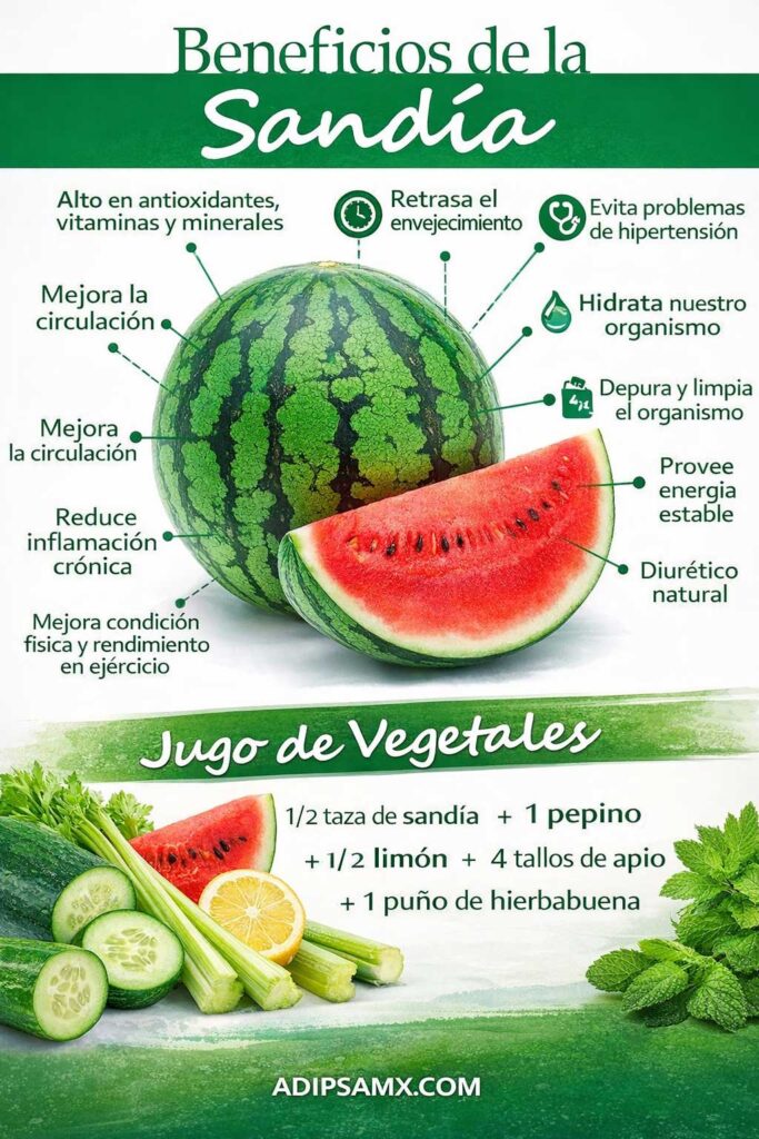 Descubre sus increíbles beneficios: mejora la circulación, ayuda a desintoxicar el cuerpo, aporta energía natural y favorece la salud de la piel. Además incluye una receta fácil de jugo de sandía con pepino, limón, apio y hierbabuena perfecta para desinflamar y mantenerte hidratado.